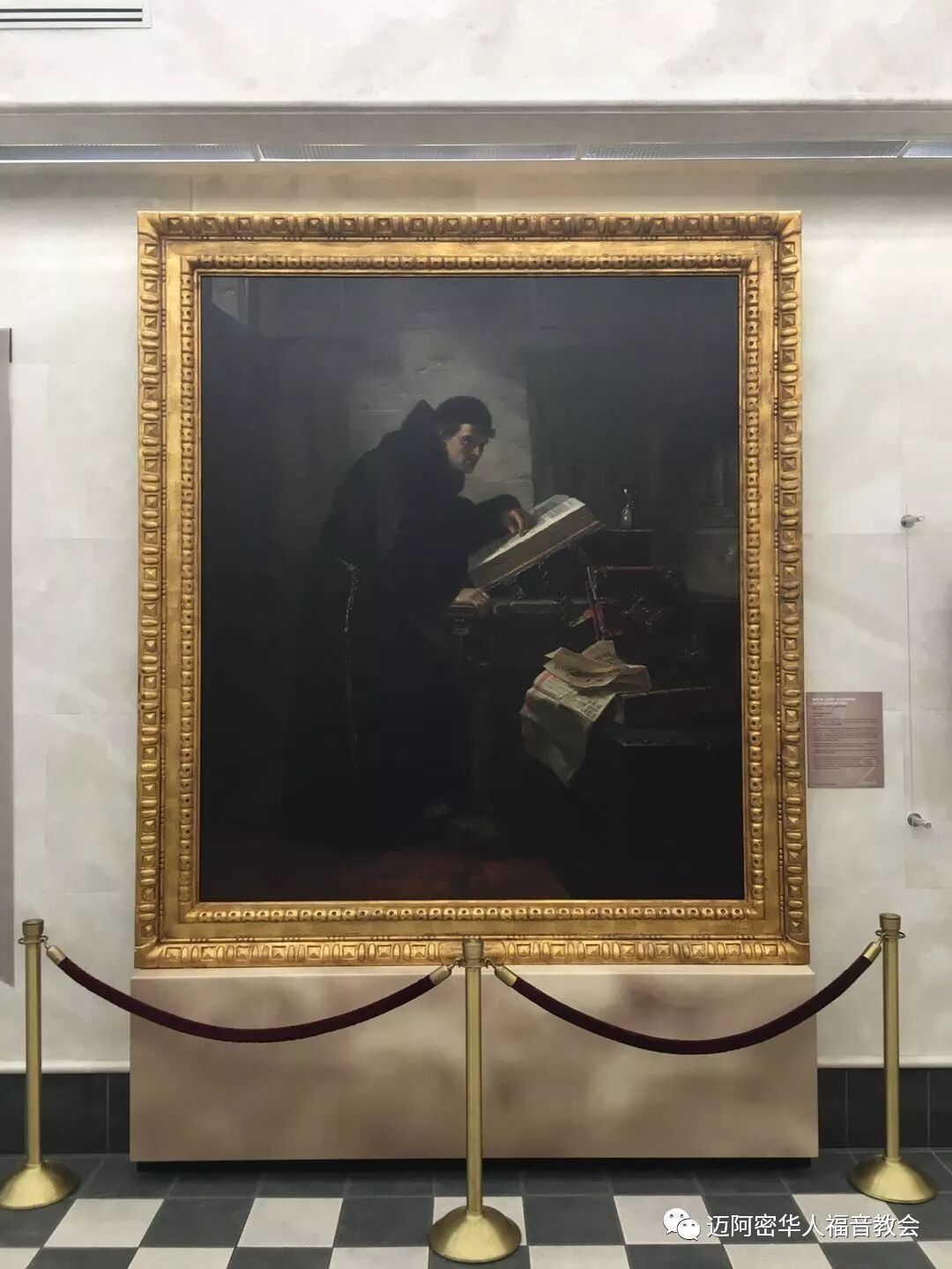 (油画:1517年十月三十一日,路德贴上九十五条。两对对抗的群体分别是更正教和罗马教庭。骑在马上象达芬奇最后晚餐中的犹大一样托着钱箱的就是到德国推销赎罪券的约翰台锁。宫牧师 拍于M&G)